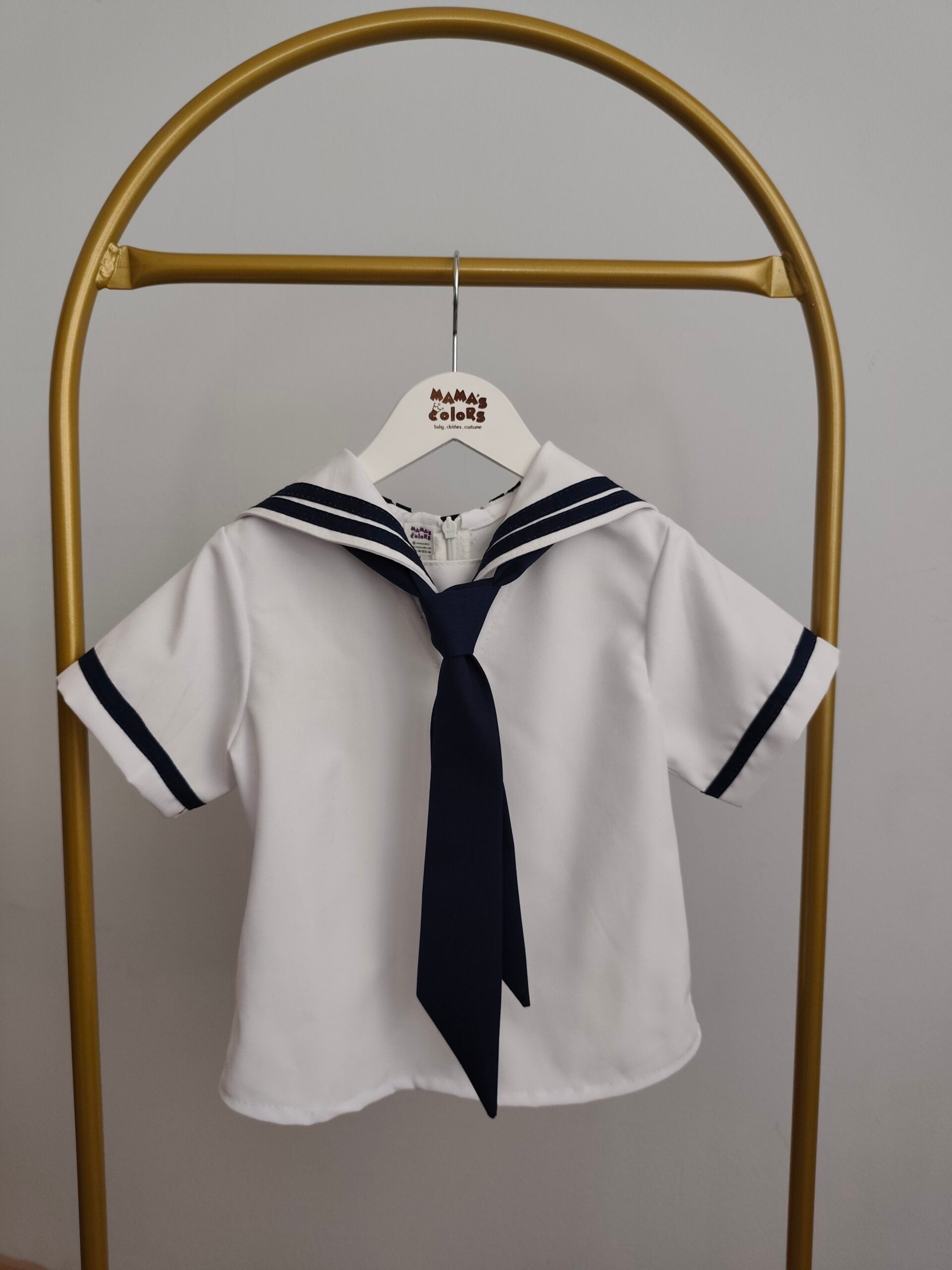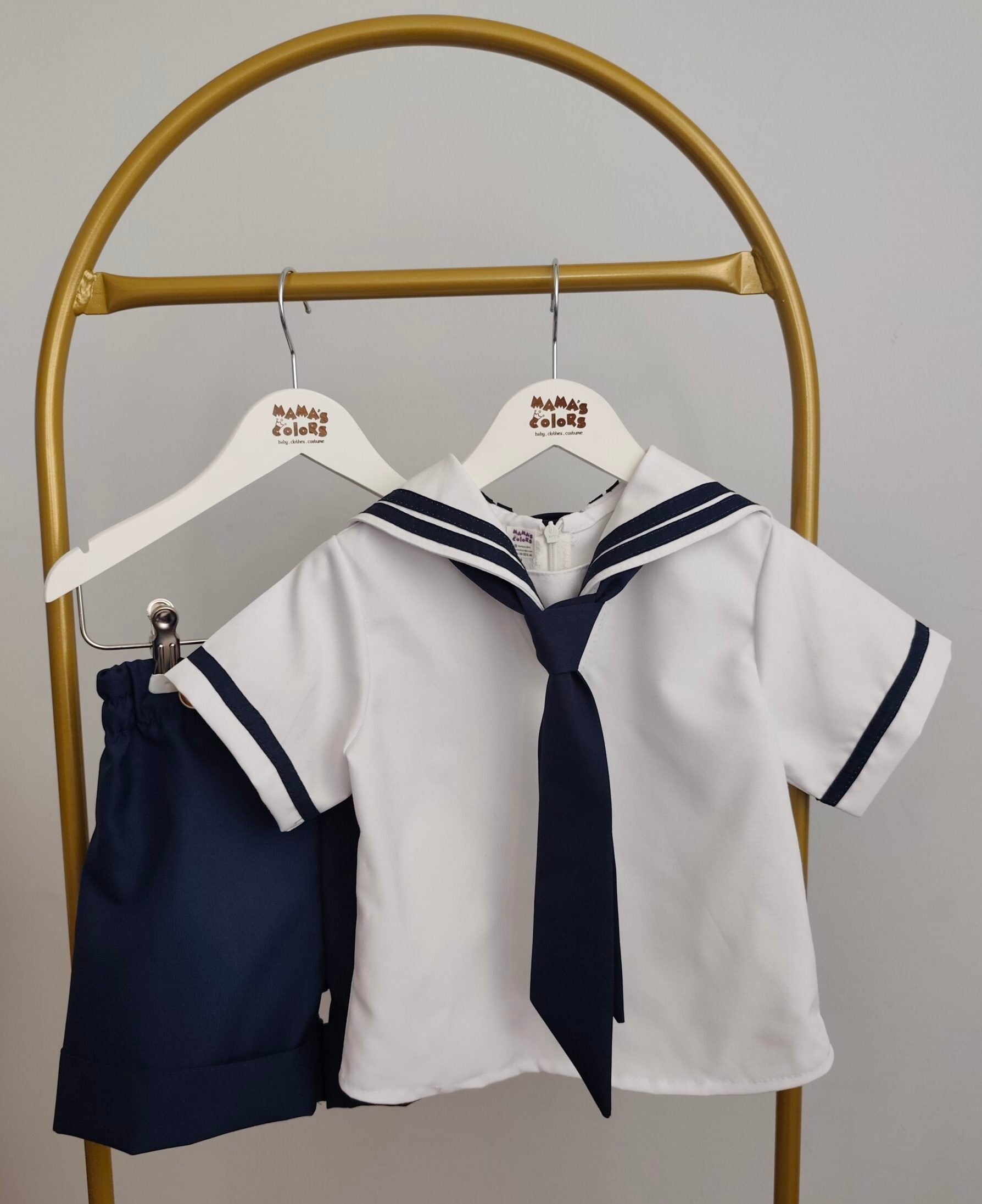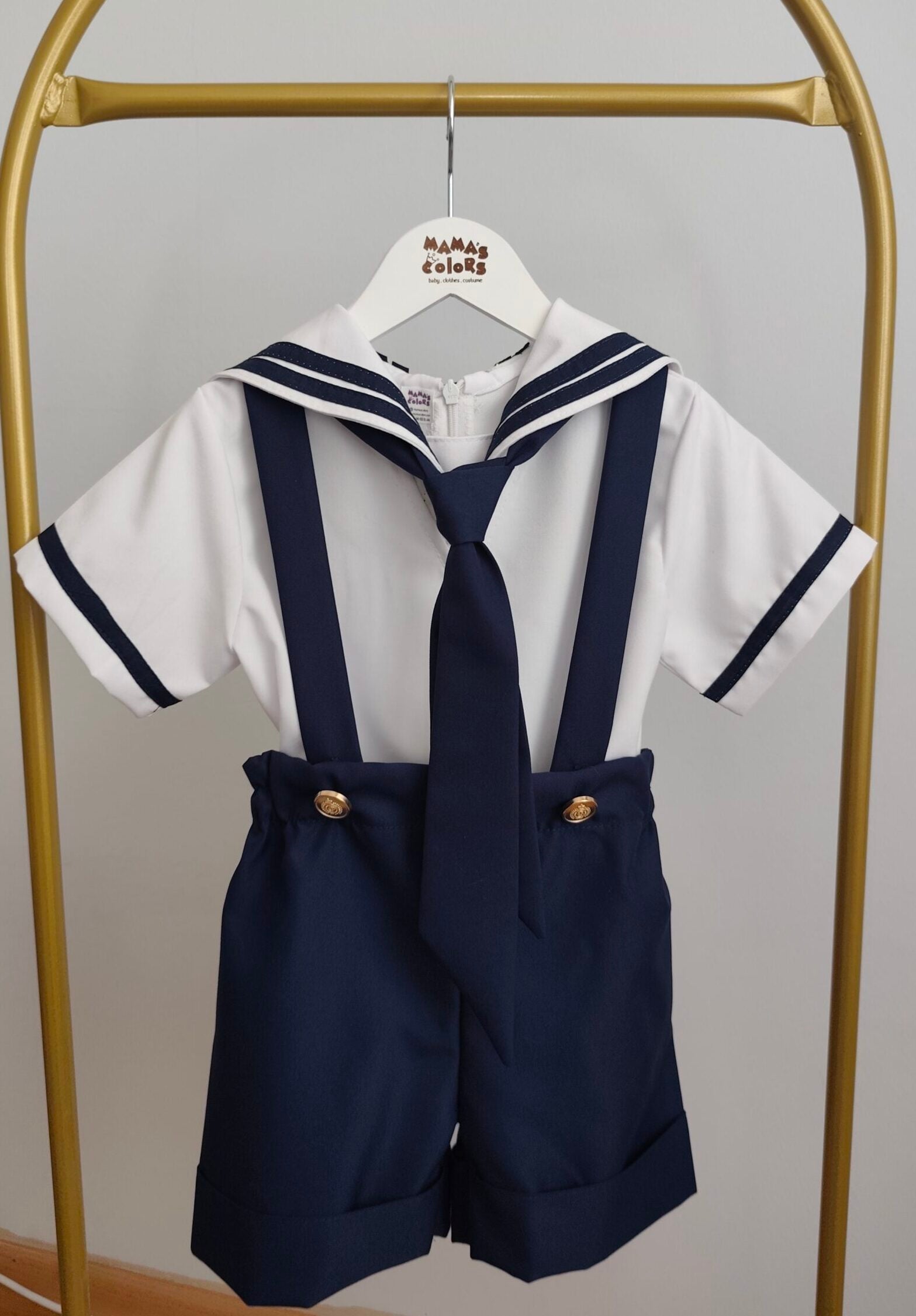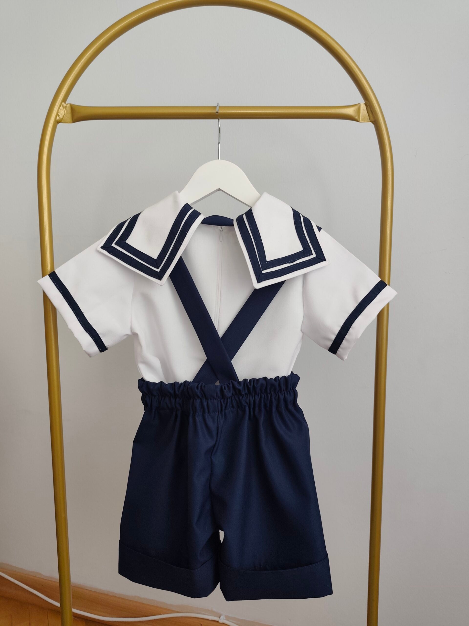 Denizci konsepti için hazırlanmış denizci gömlek, askılı lacivert şort ve lacivert yaka kostüm takımı.