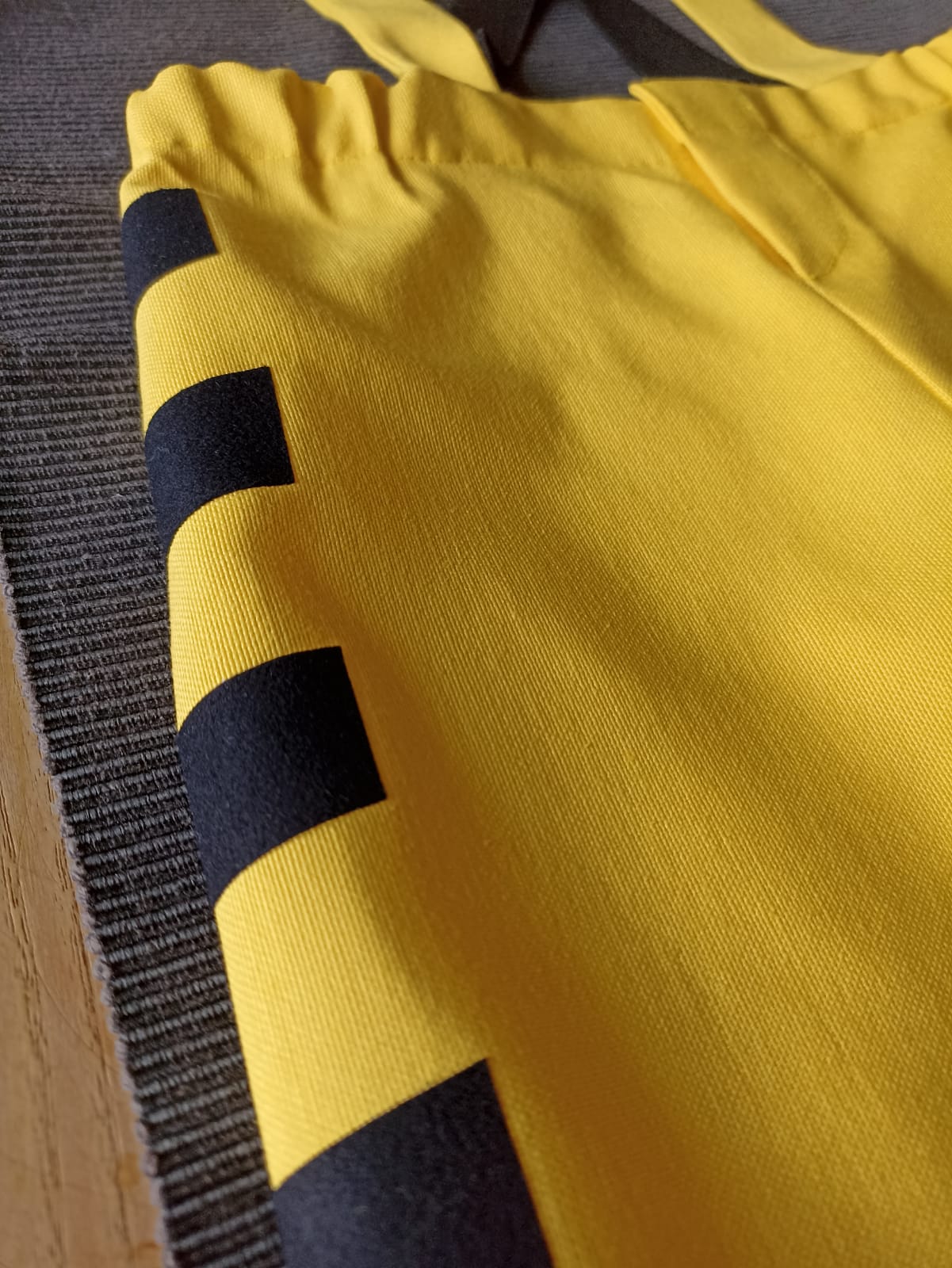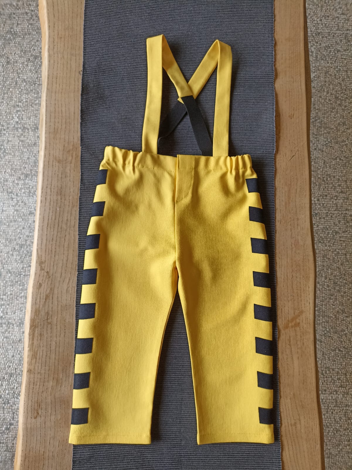 – Askılı, siyah şerit desenli sarı keten pantolon/salopet