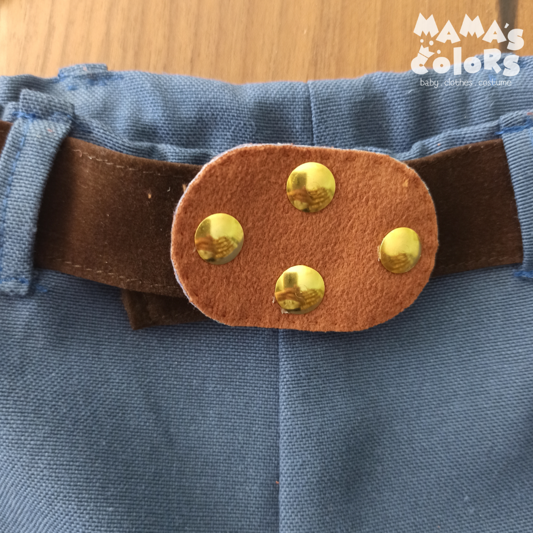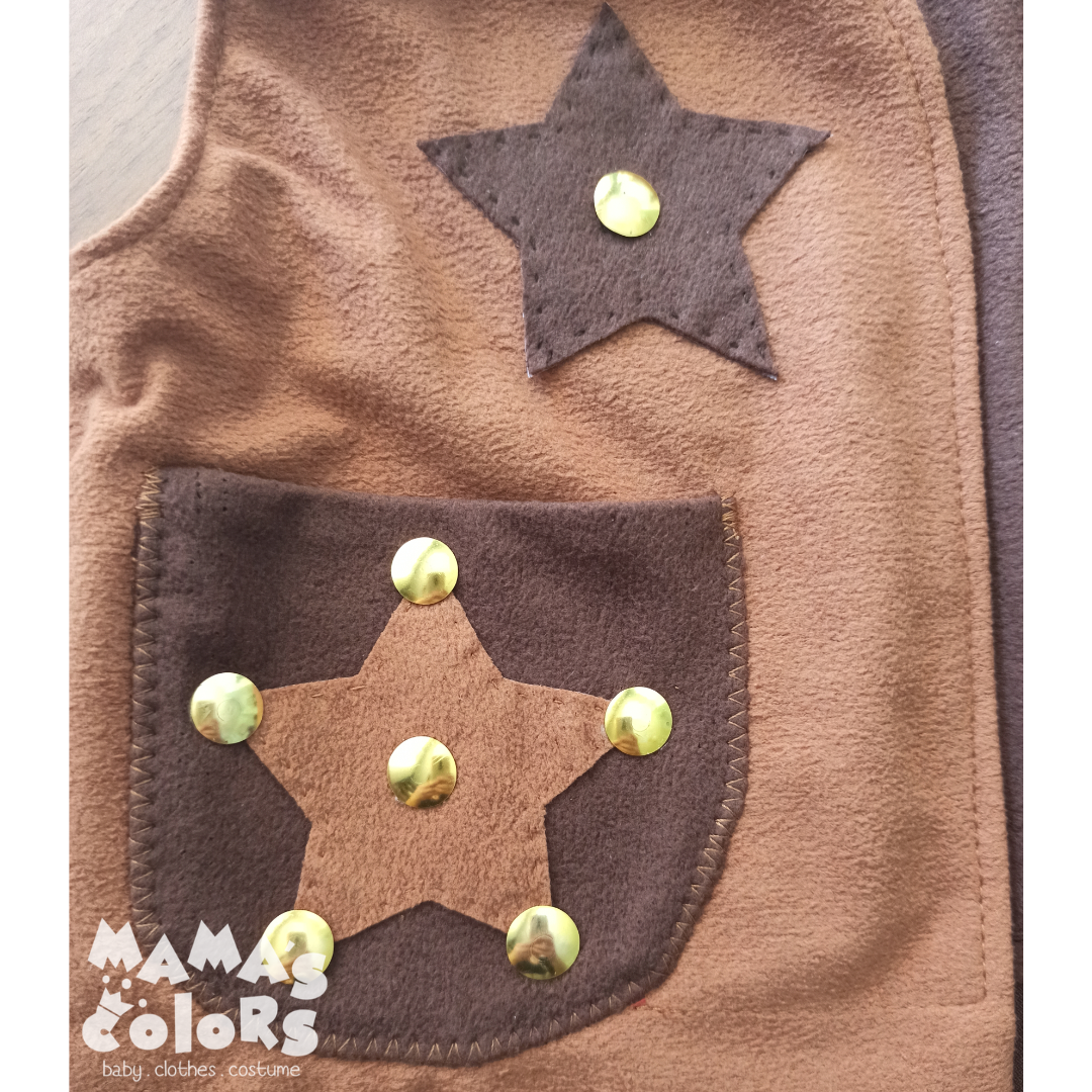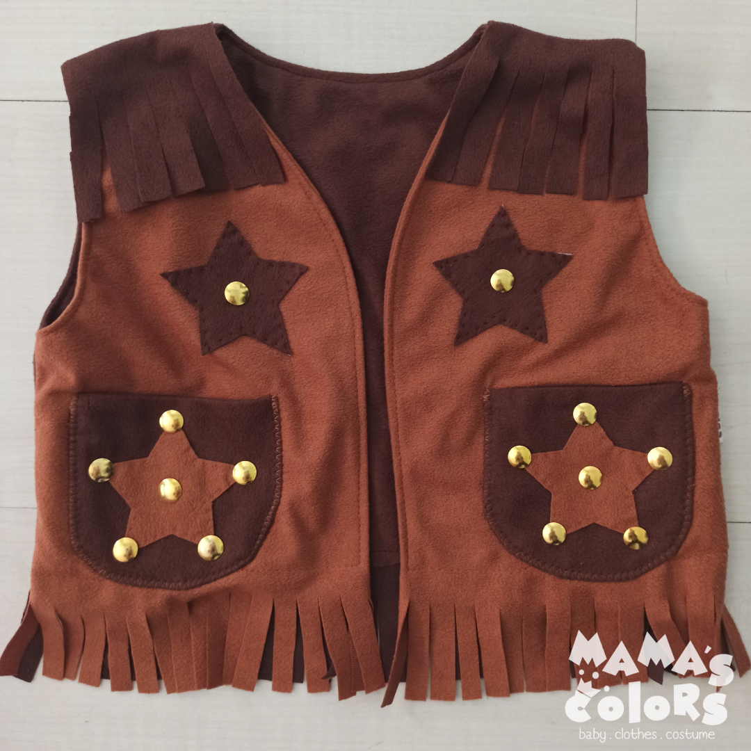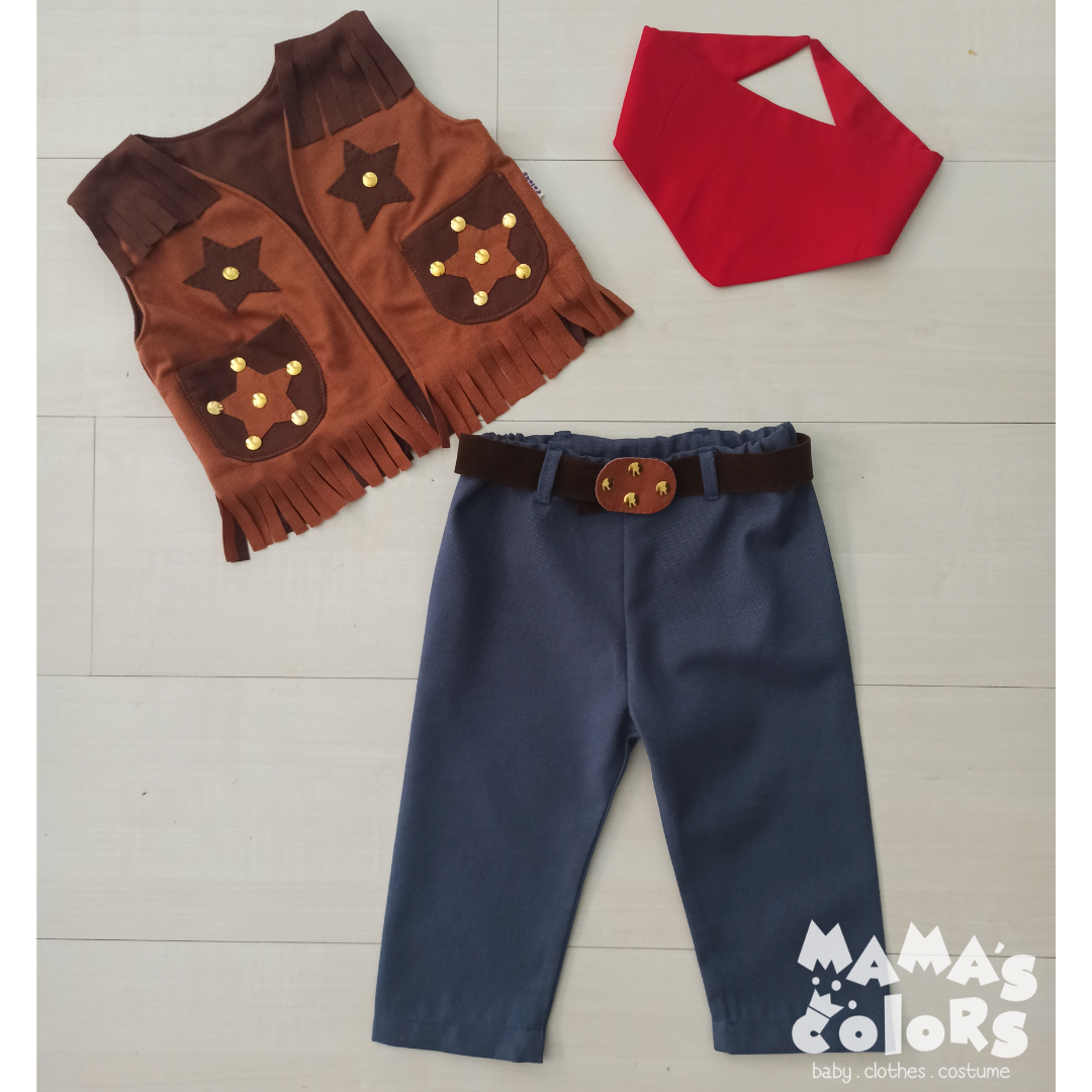 Kovboy kostüm seti; pamuk süet kahverengi yelek, denim keten pantolon, kırmızı pamuklu fular ve kemerden oluşmaktadır.