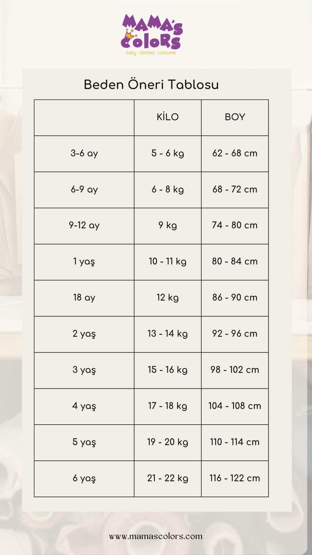 6 ay – 6 yaş arası istediğiniz bedende hazırlanabilir. 6 yaş üzeri bedenlerde hazırlanmamaktadır.