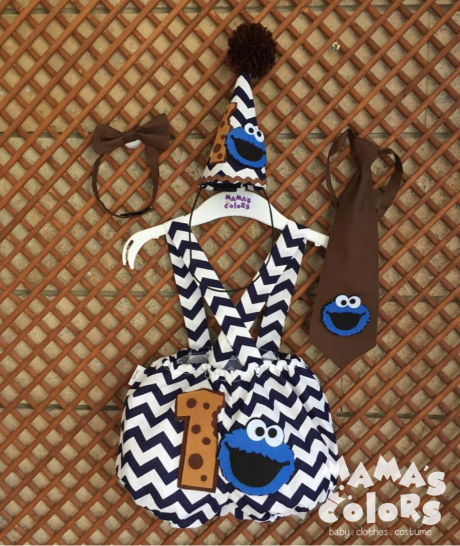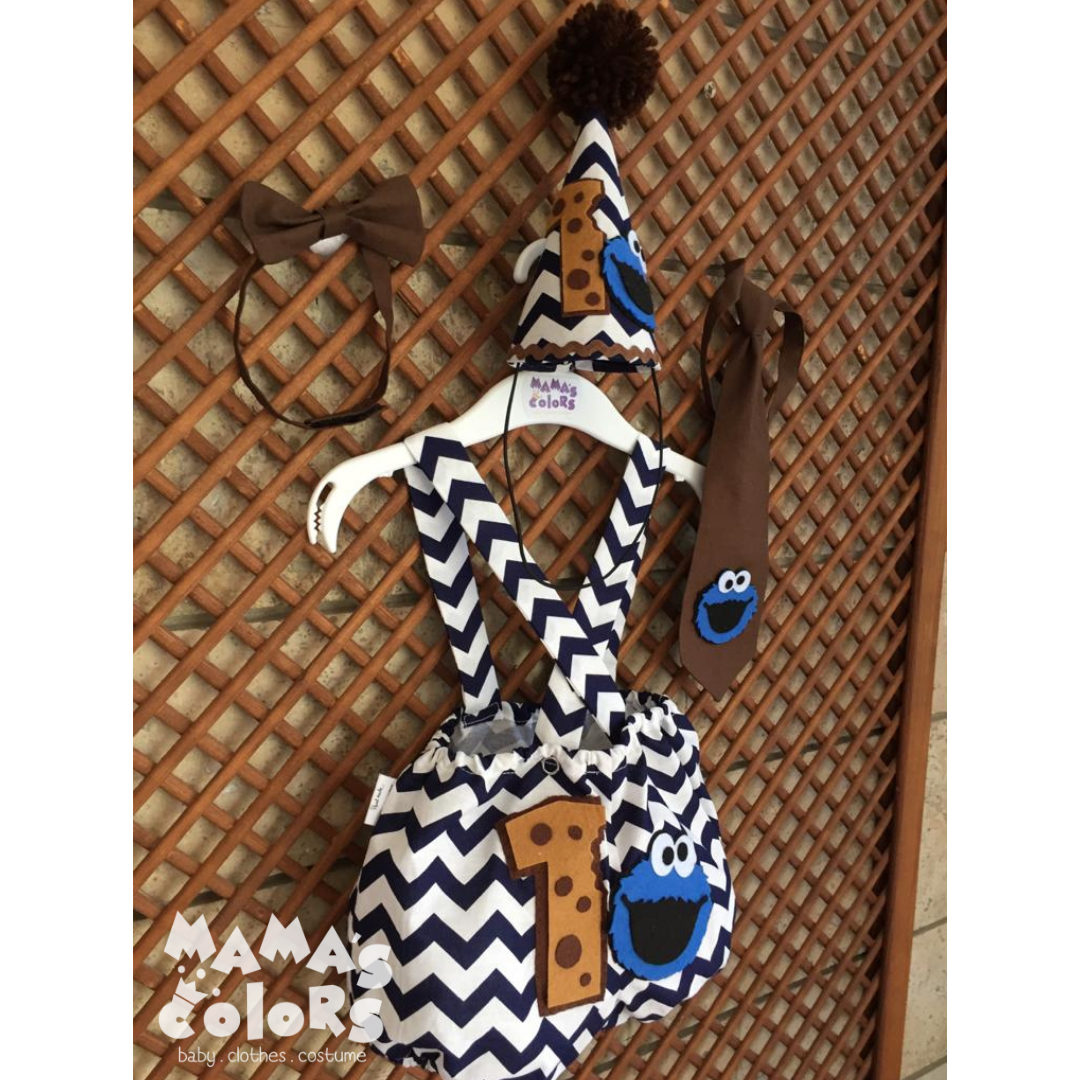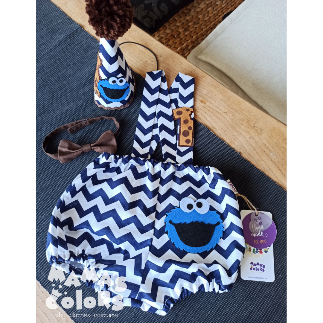 – Kurabiye canavarı ve 1 (yaş) süslemeleli lastikli askılı şort veya pantolon