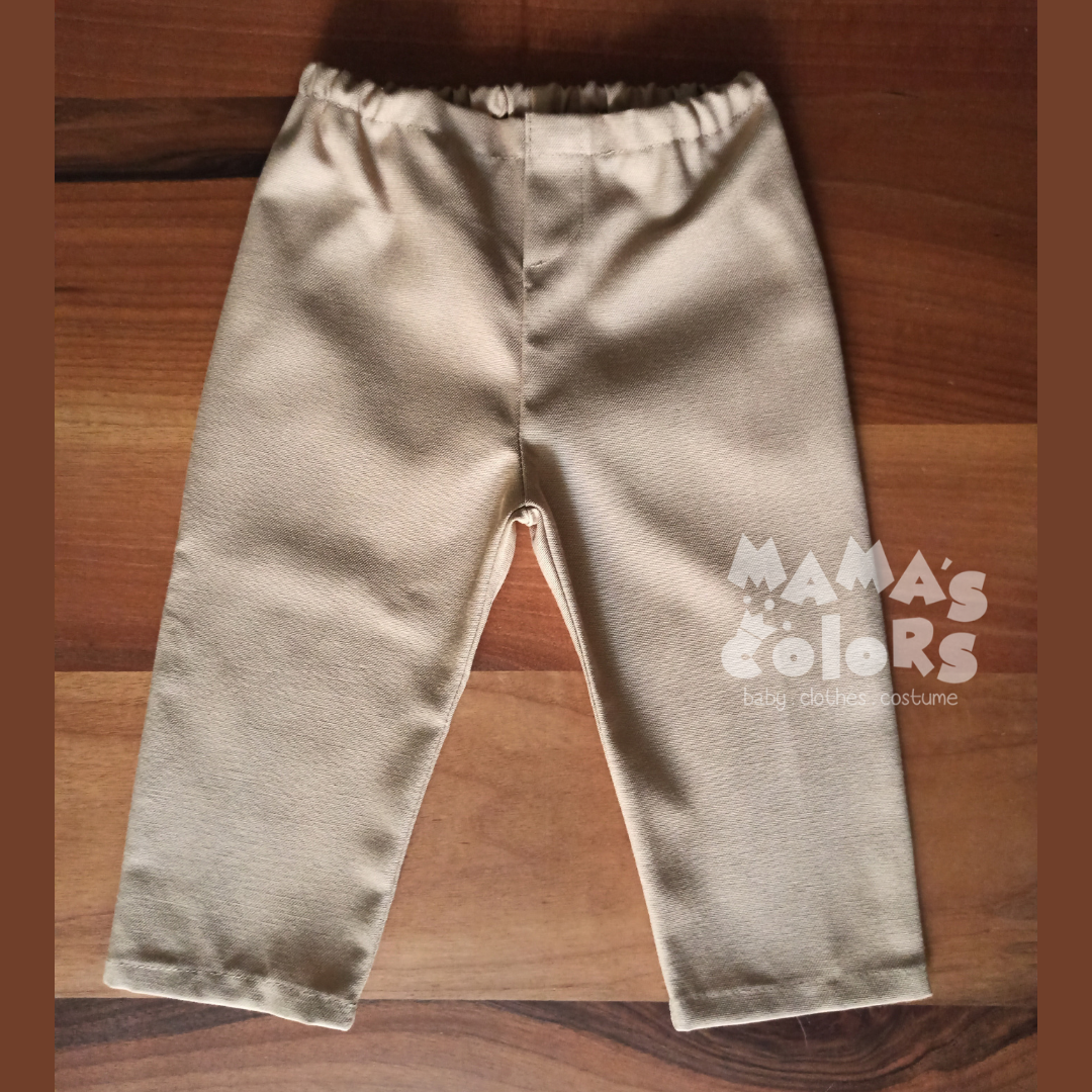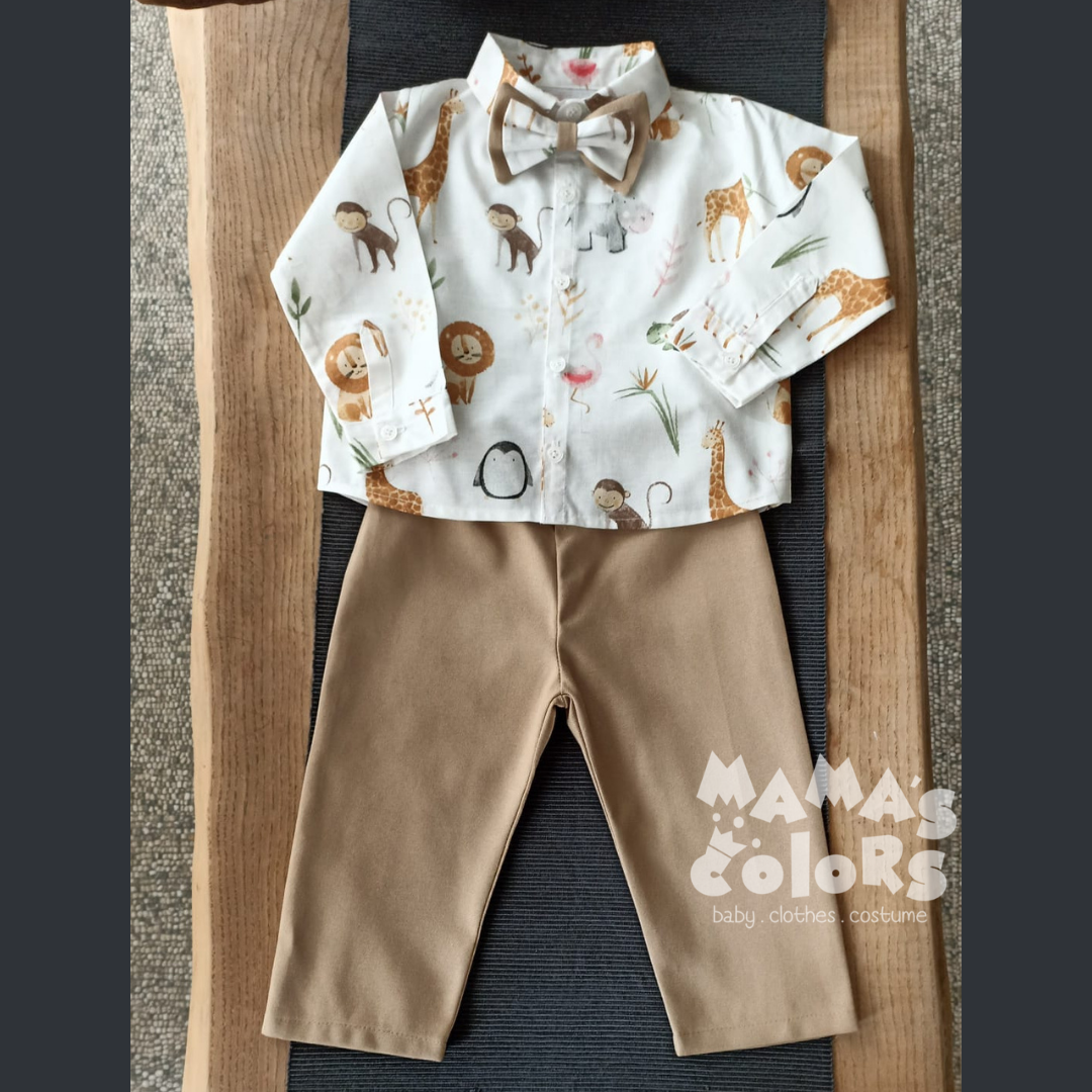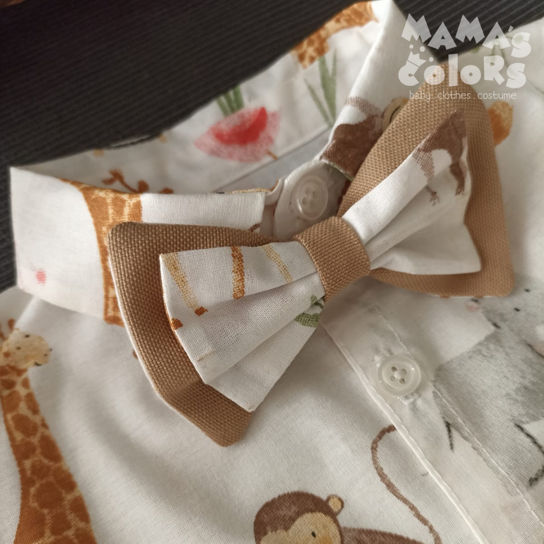 Safari desenli gömlek, papyon ve şort takımı; şort beli lastikli keten kumaştan, gömlek %100 pamuklu kumaştan hazırlanmaktadır.